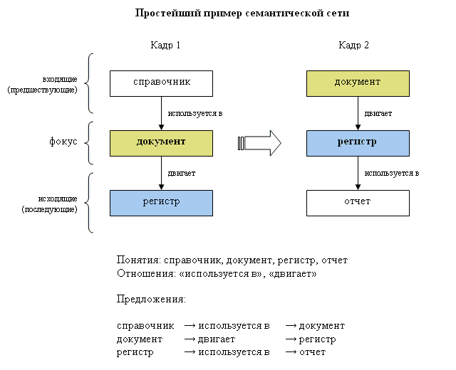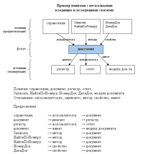 http://www.mista.ru/dot/buh_contr.gif Это фрагмент структуры конфигурации "Бухгалтерия 7.7". Вершины - это идентификаторы объектов, дуги - это отношение между объектами (отношение "является свойством"). Если расширить понимание, то получится, что в вершинах могут быть любые понятия, а список отношений тоже может быть достаточно длинный и разнообразный. |
