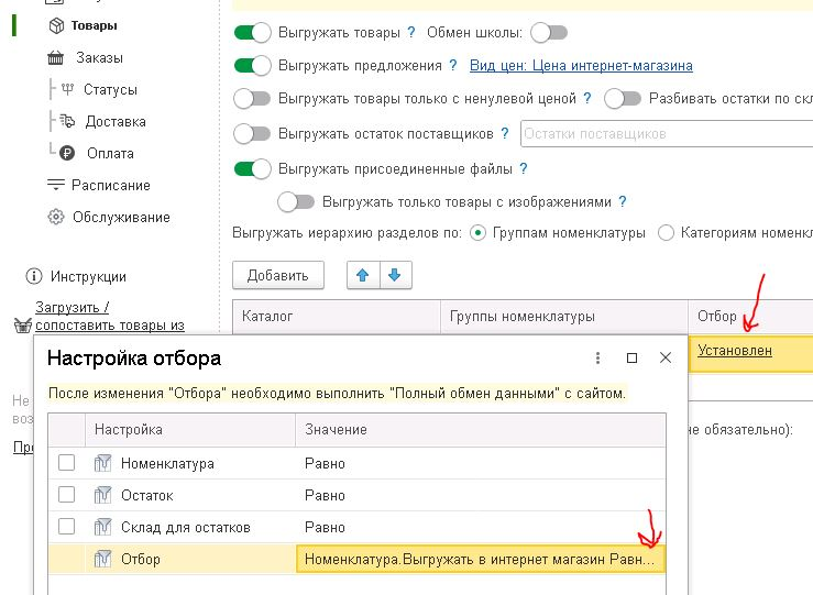 В базе УНФ, настройка обмена с сайтом: на вкладке товаров в таблице к выгрузке есть колонка "Отбор", отображаемое значение в колонке "Установить". Тыкаем на "Установить" и напротив слова "Отбор" указываем значения отбора.