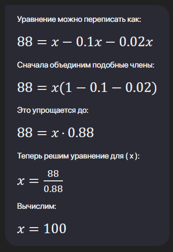 10 это 10% 2 это 2% 88 это (100-10-2=88) тут посчитано от 100 назад а как посчитать вперед зная только 88 получается 88 = х - x*0.1 - x*0.02 как тут на 100 выйти? |