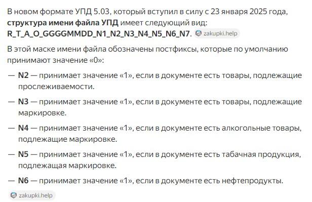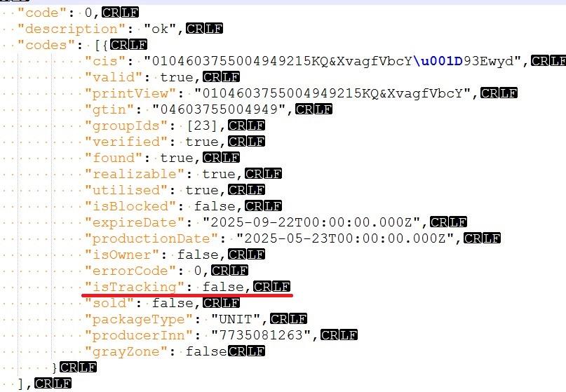 И что? Да, последние "циферки" в имени о чем-то говорят, но, сейчас лень поднимать документацию, и читать, о чем... Вроде да, какой-то реквизит говорит о том, пошлучная продукция, или ЭДО... Но, какая, не вникал. Я Вам совсем про другое говорю - при проверке марок по РР. если проанализировать ответ на запрос - реквизитыф "isTracking" и "isOwner" - чему равны? Если "isTracking" = True то Прослеживаемость включена, и "isOwner" тоже должен быть True. Иначе, это не Ваш товар. А вот, если Если "isTracking" = False, то пофик - это ОСУ, и товар может принадлежать кому угодно, Вас это не должно ни как волновать. Хотя, вот: ![]() У Вас в (21), как раз поле 2 равно 0. (не путать N1 это сам "длинный" UID, а поле N2 это первая циферка после него). То-есть, УПД не содержит прослеживаемых товаров. Правильно это или нет - я х.з... Смотрите на проверку товара по РР а не на имя файла УПД... |