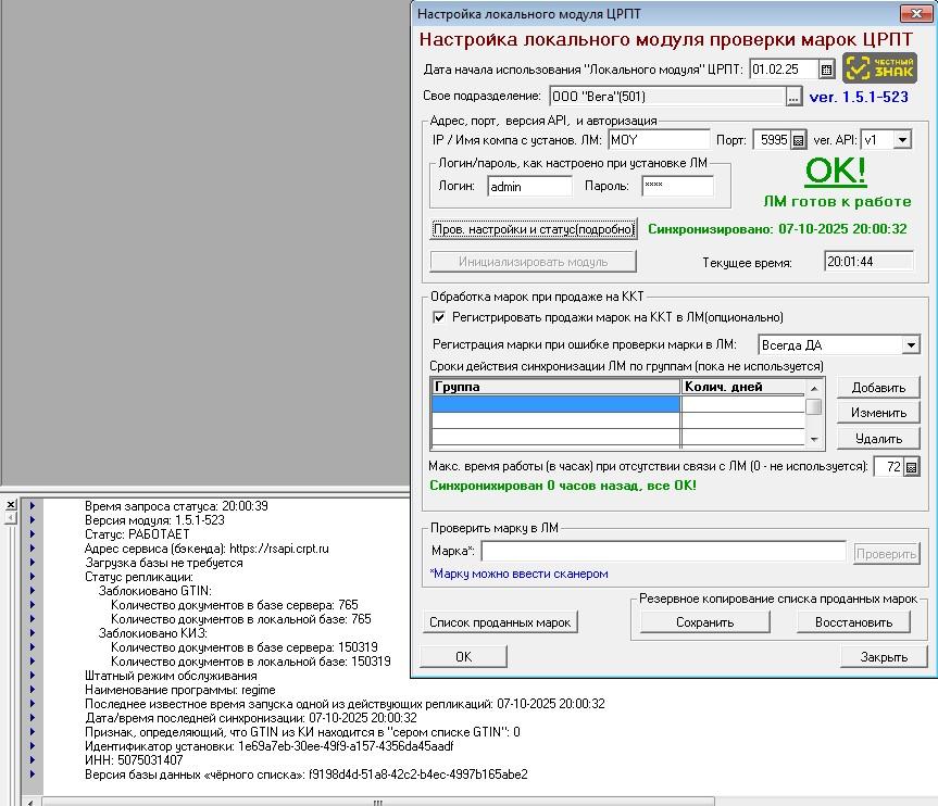 А... Ну, еще, в свежих версиях появилассь опционально(пока не обязательно) возможность фиксировать продажи марок "у себя". Пишутся при включении этой опции все, не зависимо от того, где проверялось в ОнЛайне или в ЛМ. Хранятся месяц от даты продажи. "На верх", на сервера ЦРПТ не реплицируется. Чисто ограничение продаж дублей по своим точкам.