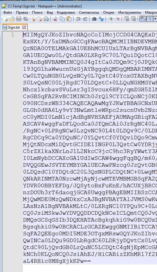 (17) Ну, да, есть такая функция. Делает в принципе то-же самое, что у меня несколькими строками пешком было... Только проще - на вход двоичные данные из менеджера, на выходе готовый файлЭЦП в база64 и без переноса строк. Так конечно удобнее.