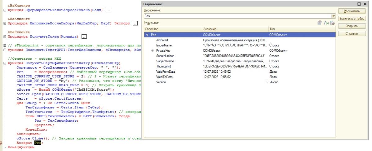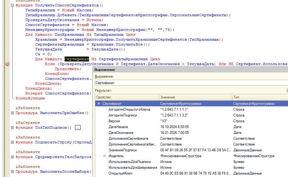 Ну, х.з.... Уже в принципе не актуально, на боевую задачу это не повлияет... Но, как говорится, "истина дороже!" :-) Вот, сертификат 1С:  А вот, сертификат КриптоПро:  Конечно у них типы разные, CADESCOM ждет COMобъект, а получает вместо этого "что-то не понятное от 1С" - "СертификатКриптографии", отсюда и ошибка несоответствия типов... Может и можно как-то преобразовать Сертификат 1С в COMобъект, который схавает CADESCOM, но оно того не стоит... Уберу при настроениии получение сертификата через МенеджерКриптографии, оставлю только CADESCOM... (27) Вот, не жалко, тем более это код из описания TrueAPI с минимальными доработками и исправлением ошибок: Функции подписи через CADESCOM// sThumbprint - отпечаток сертификата, используемого для подписи; строка,