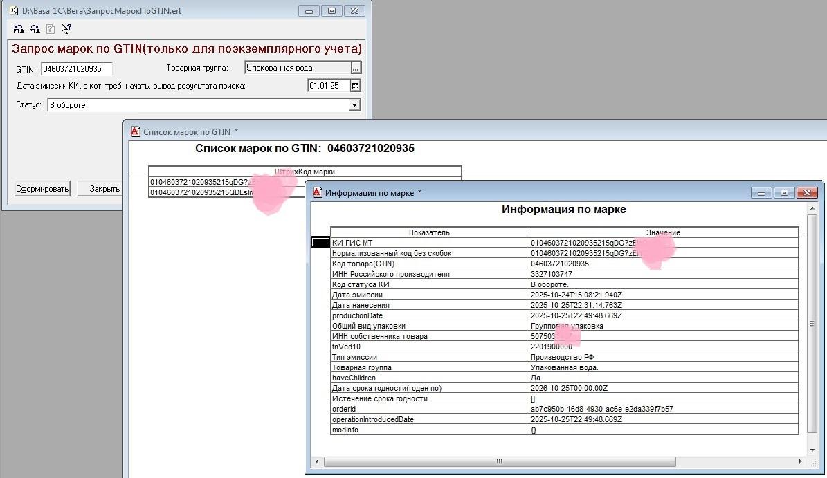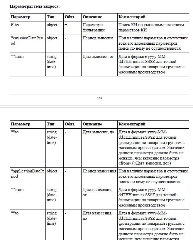 Сами смотрите: Метод позволяет получить информацию по КИ / КиЗ, числящихся на участнике оборота товаров по заданным фильтрам. При этом, одно из обязательных полей фильтра - это GTIN. Смотрите таблицу описания полей запроса там-же, чуть ниже. PS Не знаю, будет настроение - в выходные(завтра-послезавтра), я постараюсь у себя сваять такой запрос, для получения списка марок, например по воде. Но, сразу говорю - первый раз буду делать в 7.7. Мне так быстрее и проще. Потом, после отладки и получения приемлемого результата, может и на 8.3 нарисую, как отчет карточки и марки сделал :-) |