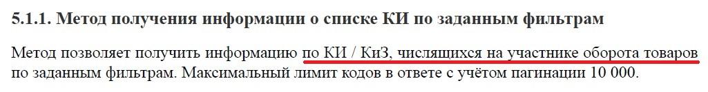 api/v4/true-api/cises/search Метод позволяет получить информацию по КИ / КиЗ, числящихся на участнике оборота товаров по заданным фильтрам. Максимальный лимит кодов в ответе с учётом пагинации 10 000. |