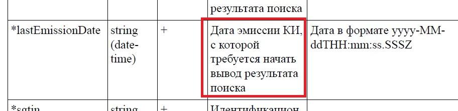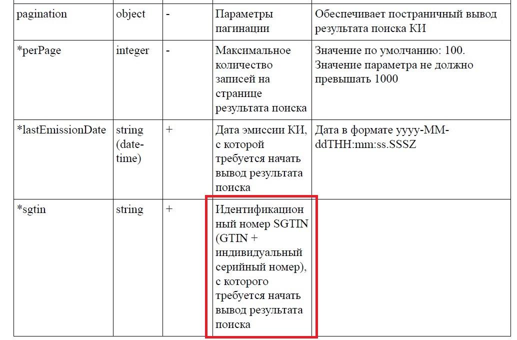 ![]() На самом деле - это не дата "с", как написано, а дата "по"... Передаю туда не начало года, как было, а рабочую дату. Теперь выводит без отбора по GTIN 1000 марок, максимально возможное количество на странице, а как вывести следующую страницу - не понятно... Вроде как есть параметр: ![]() Но, что я только туда не передавал - и самое очевидное, ID последнего, 1000-ного SGTIN, строкой, как от них прилетела, и пробовал "уродовать" его, как написано, оставляя только GTIN+серийный номер, и пробовал и 1000, и 999 числом, пох, не реагирует, так и выводит первую 1000. Опять какой-то косяк, но, какой и где - пока не понял... Тут уже похоже не в описании, а на сервере... |